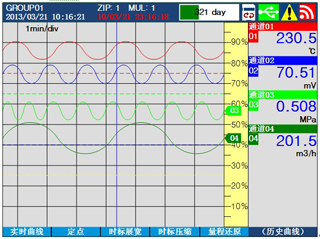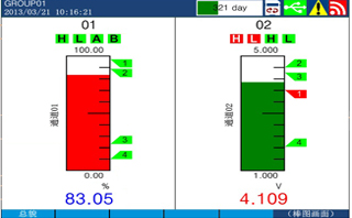 總顯畫面(4個路時時測量值顯示在同一屏幕)對每個組的測量數據可以進行實時曲線顯示、數字顯示和棒圖顯示。