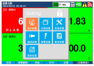 可設定設備名稱、系統時間、系統密碼、系統語言、記錄間隔、冷端補償、信號輸入類型、量程和單位、小數點位,測量值誤差修正設定、設定報警參數、設定變送輸出參數、打印組態參數、累積報表參數、通訊組態參數等。