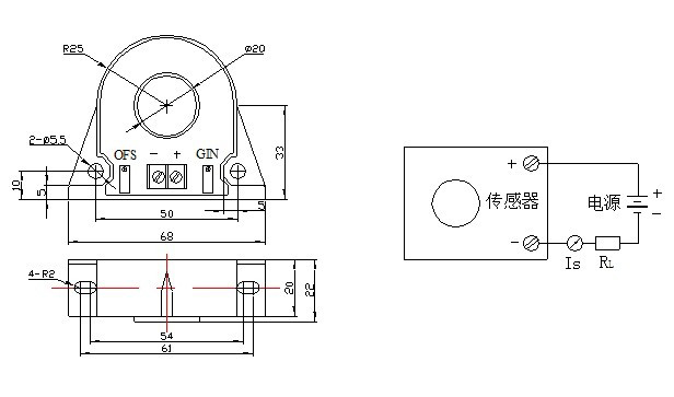 1、傳感器正確接線后,當(dāng)被測(cè)電流從傳感器穿過(guò),即可在輸出端測(cè)得相應(yīng)的電流值。