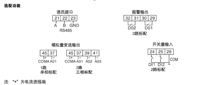 功能和特點: 1、顯示倍率、通訊地址,波特率等通過面板上按鈕可設置,使用非常靈活方便。 2、可選模擬量輸出,輸出為4~20mA,0~12~20mA等可選。 3、可選兩路報警輸出,對被測量參數實現上下限監控。 4、可選RS-485數字接口,采用標準MODBUS-RTU協議。 5、可選2路開關量輸入,可監視系統內開關量狀態。 6、數字校零、數字校調,精度高,性價比極高。