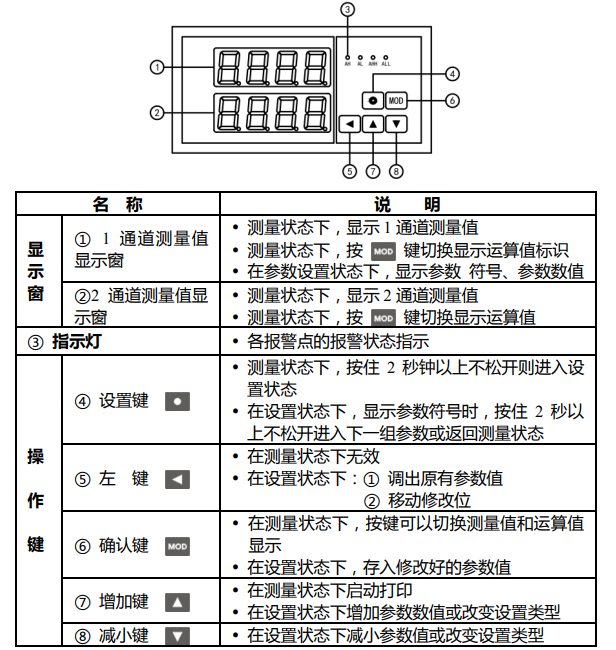 4:報警:最多4點報警輸出,可設置為2個通道測量值或運算值的上、下限。