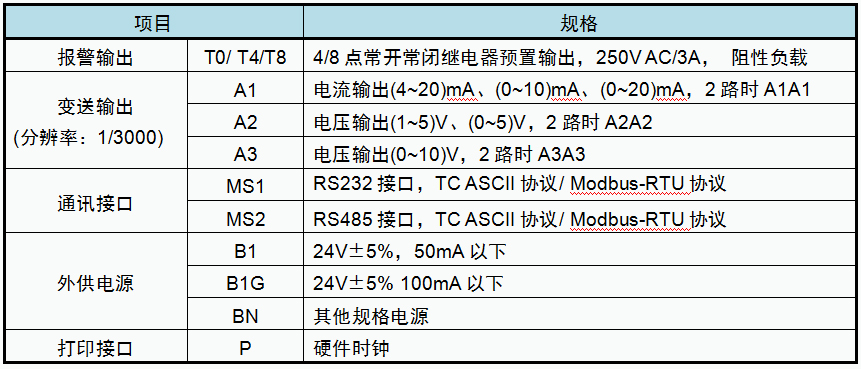(最多可選擇2路變送輸出;分辨率:1/3000;負載能力:600Ω) |