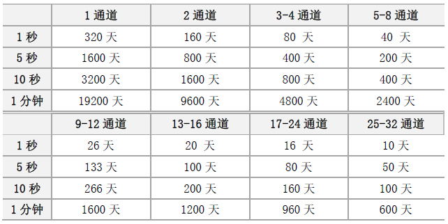 32通道,可記錄10天; 不同通道數(shù)且連續(xù)存儲時(shí)長如下,其它記錄間隔按倍數(shù)加倍記錄時(shí)長.